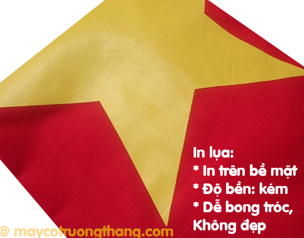 In lụa là phương pháp in xuyên; dùng hỗn hợp keo pha với mực được nén lên bề mặt vải. Nên tính thẫm mỹ, độ bền không cao, qua một thời gian sử dụng lá cờ dễ bị bong tróc không thẩm mỹ.